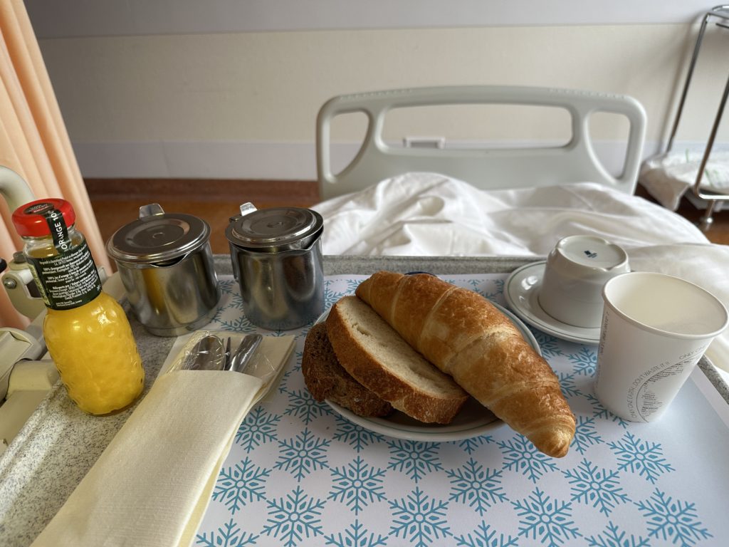 Après une prise de sang à 6h tapantes, le petit-déjeuner arrive vers 7h45. Enfin un café, youhouhouuuuuuuuuu !!!!!!!!!!